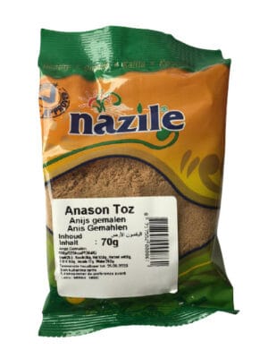 Onze gemalen anijs van het merk Nazile wordt geleverd in een handige verpakking van 70 gram. Deze specerij wordt zorgvuldig geselecteerd en fijngemalen om geur en smaak optimaal te behouden. Verkrijgbaar bij Lekker-zeg.com – ook in hele zaden.